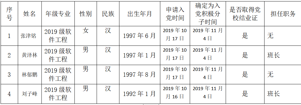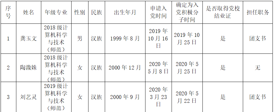经学院计算机科学与技术(师范)一党支部培养考察,在听取党小组、培养联系人、党员和群众意见的基础上,经党支部(或支委会)讨论,确定龚玉文等3同志为发展对象。现根据学校发展对象备案制度进行公示,公示期为202...