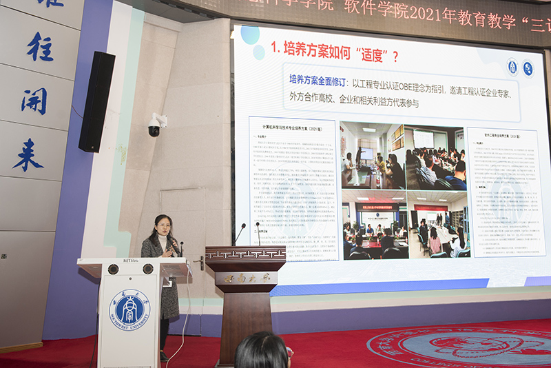 软件学院第三届“教研活动周”实施计划》等文件要求,我院于2021年11月19日下午14:30,在25教1楼报告厅召开全体教职工大会,围绕“院长说办学、专业负责人说专业、教师说教学”的主题开展了教育教学“三说”活动。活动由学院分管教学副院长陶丽主持,学校本科教学督导组四位专家、院长肖国强及学院全体教职工参会。