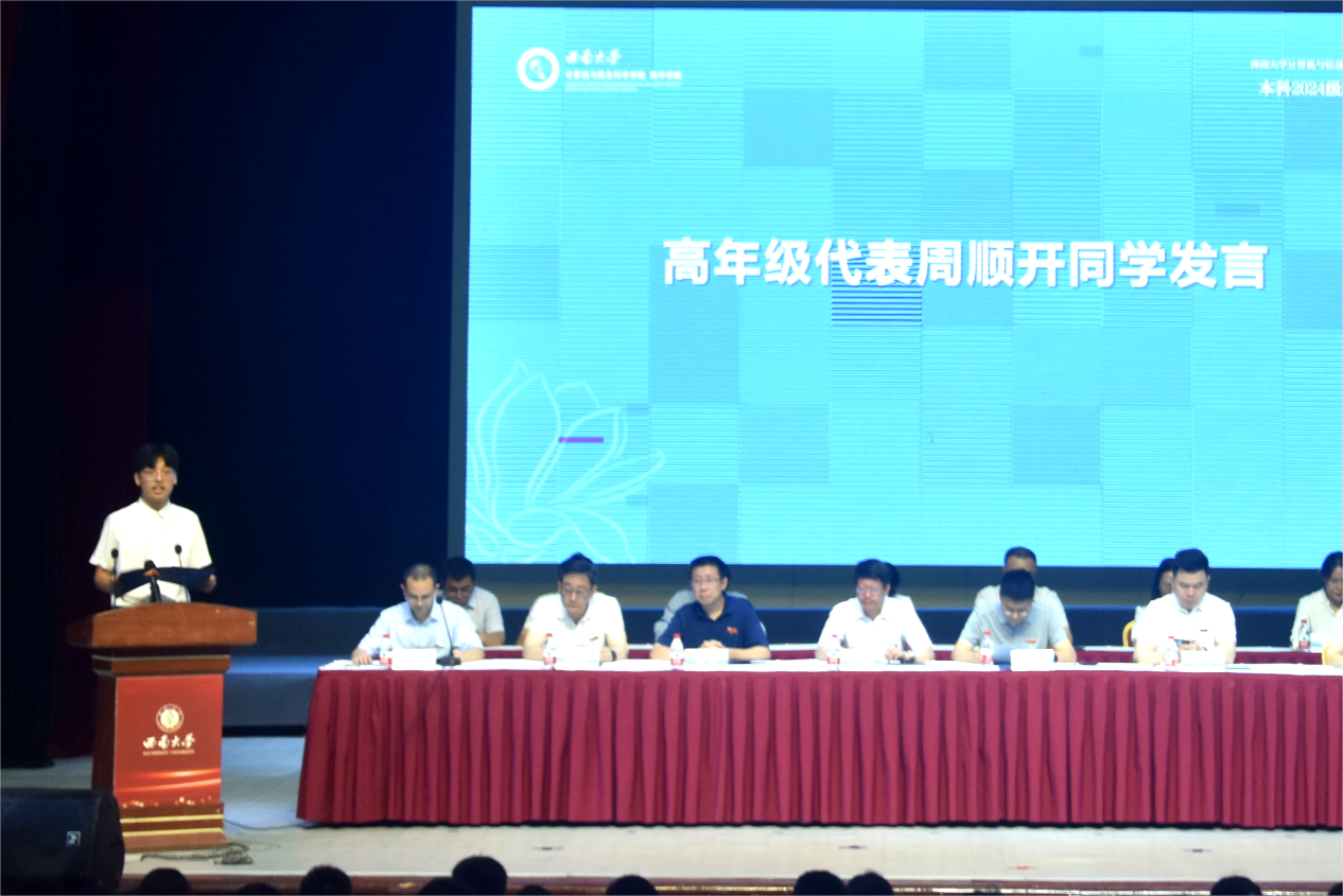 学院2021级自动化专业周顺开同学发言,他结合自身经历与在场新生分享自己的学习、科研、生活经验,为学弟学妹们提供切实建议,鼓励大家勇敢尝试,拒绝等待;坚持自律,拒绝懈怠;开放交流,拒绝封闭,努力成为“敢为人先,勇毅前行”的计信青年。