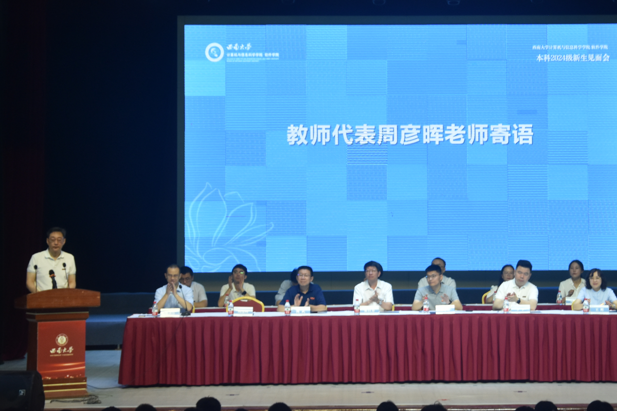 周彦晖老师作为教师代表寄语,他表示,作为计信学子应该肩负起推动未来科技进步的责任。首先,在学习方面,他鼓励同学们转变观念和方法,构建自主学习能力,独立思考,学以致用;其次,在个人发展方面,建议同学们要高度重视目标和规划,做好眼前的事,才能为不确定的未来做好准备。最后,他希望同学们学会理解和包容,积极参加各类校园文化活动,培养体育爱好,养成运动习惯,快乐而全面地发展。