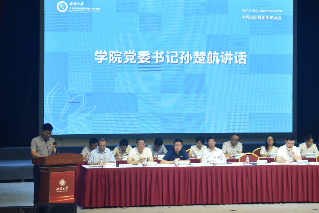 本科2024级新生见面会在光大礼堂隆重举行。学院党委书记孙楚航、院长罗辛、院学术委员会主任张自力、党委副书记王晖、副院长陈武、副院长廖剑伟、各系室主任、教师代表、全体本科生辅导员及新生年级班主任参加了见面会。见面会由学院副院长廖剑伟主持。