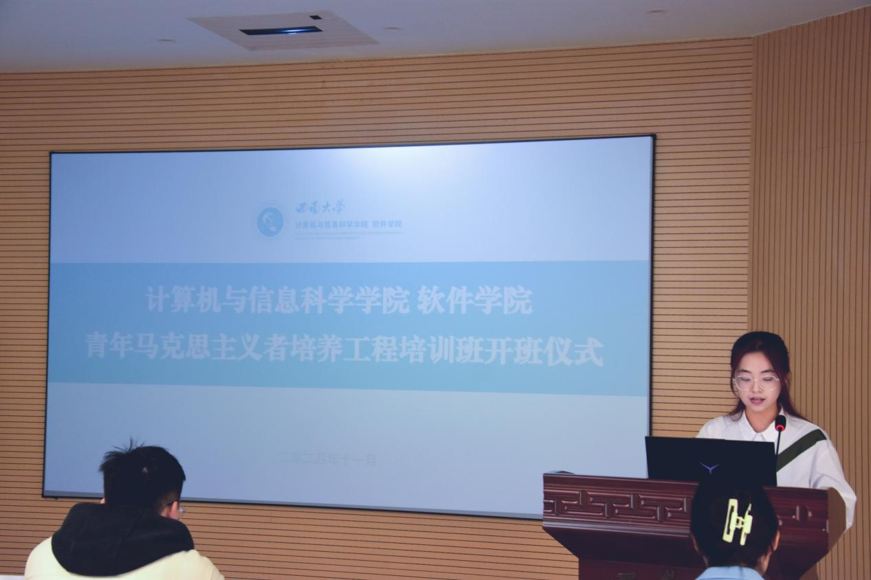 开班仪式在庄严的国歌声中拉开帷幕。学院“青马工程”第一期学员,2021级网络工程专业李婷婷作经验分享,她从“志”、“思”、“行”三方面分享自己作为首期院级“青马工程”的收获与成长。第二期“青马工程”学员、2022级计算机科学与技术(师范)专业“青马工程”成员吴军霖代表新学员发言。她呼吁学员们从坚定理想信念、践行使命担当、勇当奋斗先锋三个方面深学笃行,筑牢信仰之基,号召大家努力成长为有志气、有骨气、有底气的新时代青年马克思主义者。