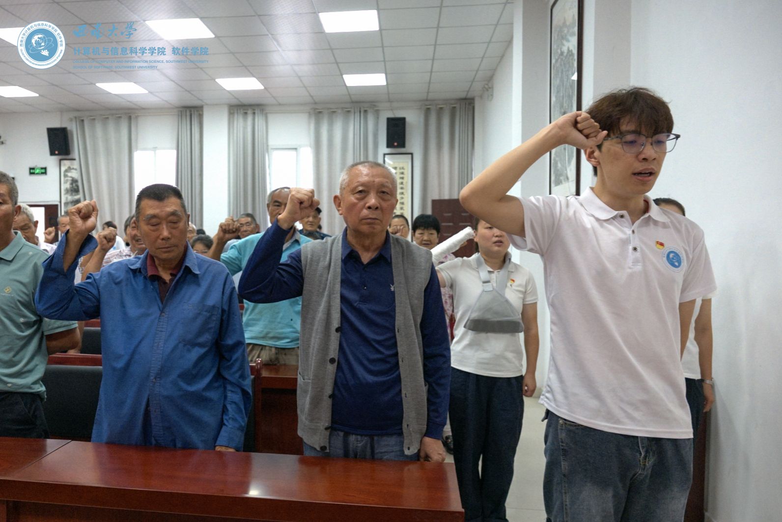 6月30日,恰逢建党节前夕,团队参与了保坪村“光荣在党50年”纪念章颁发活动。学生党员江嘉杰带领全体党员重温入党誓词,铿锵誓言回荡在会场,激励着青年学子坚定理想信念。摄影组为老党员拍摄证件照,定格信仰传承的珍贵瞬间;调研组则通过访谈,聆听老党员们的奋斗故事,感受他们从峥嵘岁月到和平年代的忠诚与奉献。