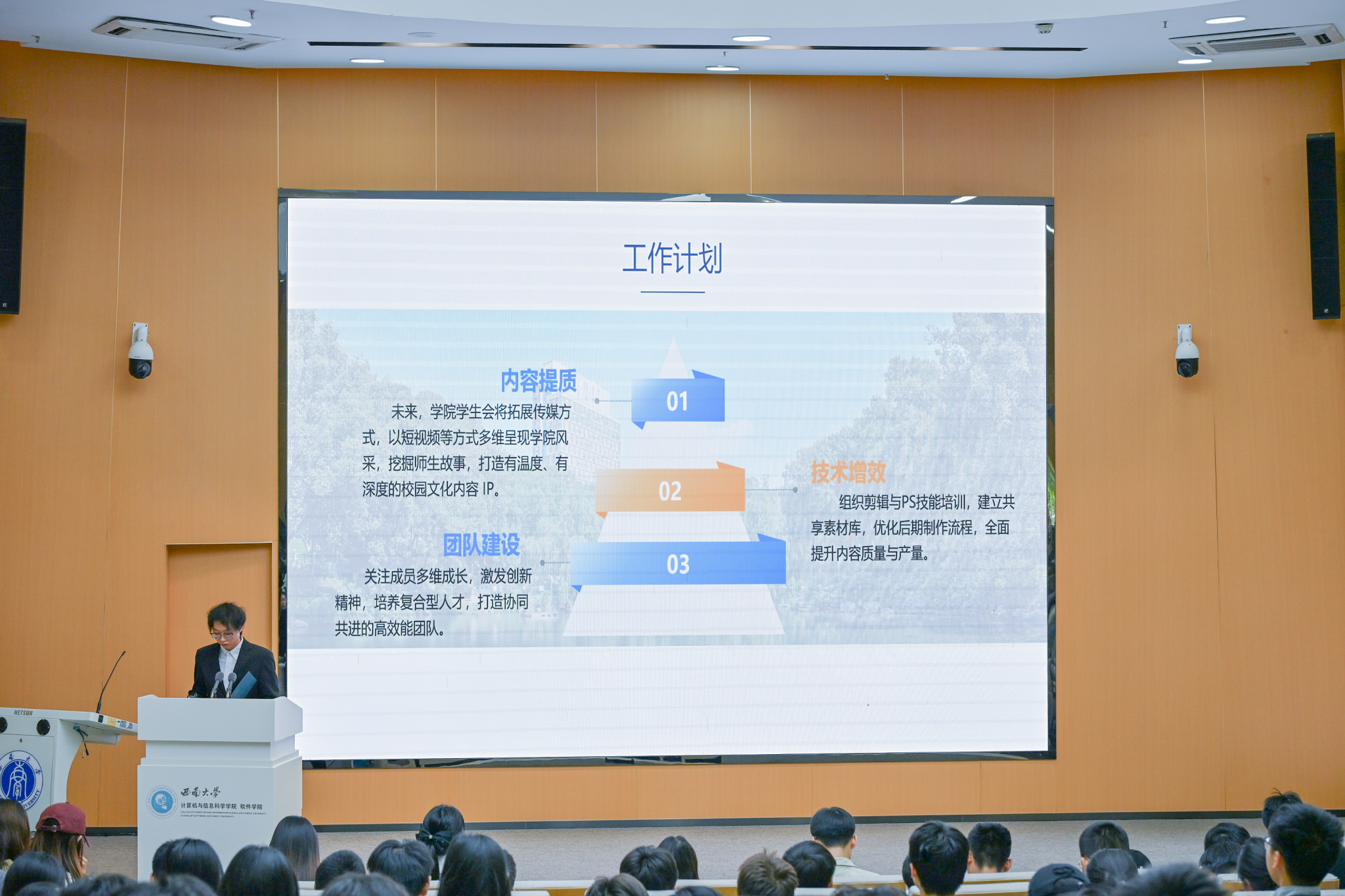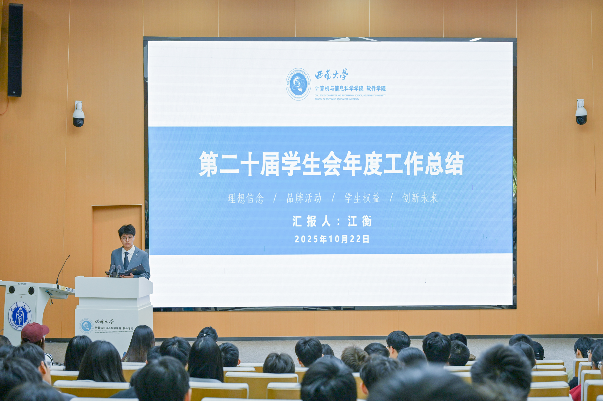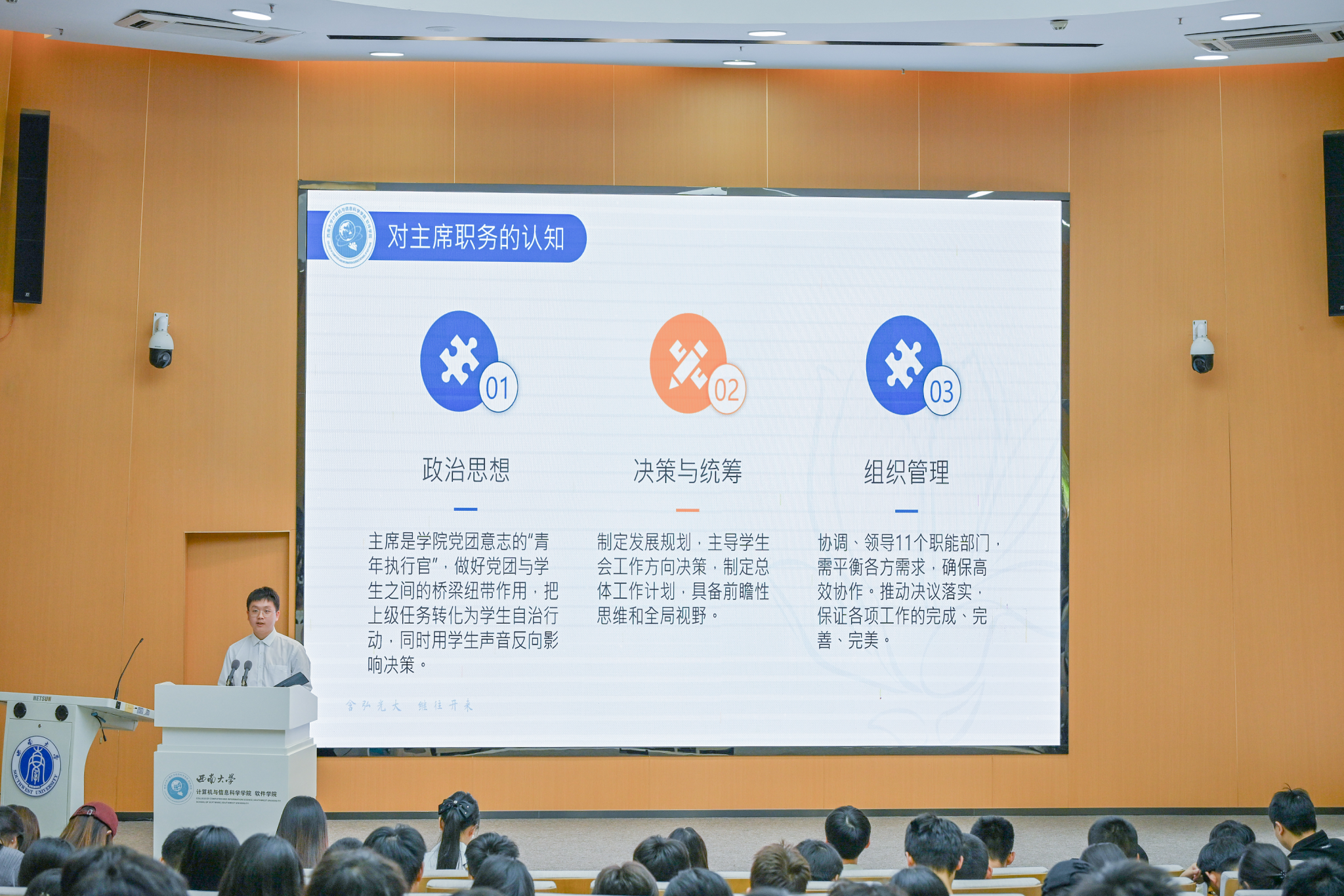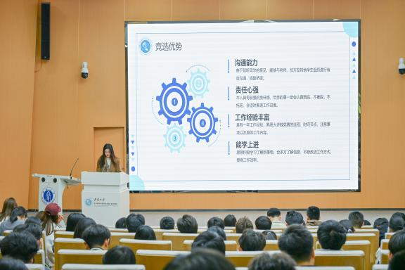 图2:第二十届学院学生会主席团成员江衡报告学生会年度工作
