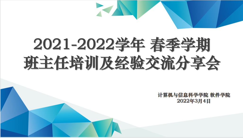 举行了2021-2022学年春季学期 班主任培训暨经验交流分享会。学院党委书记、副书记、全体班主任及辅导员老师参加了本次活动。