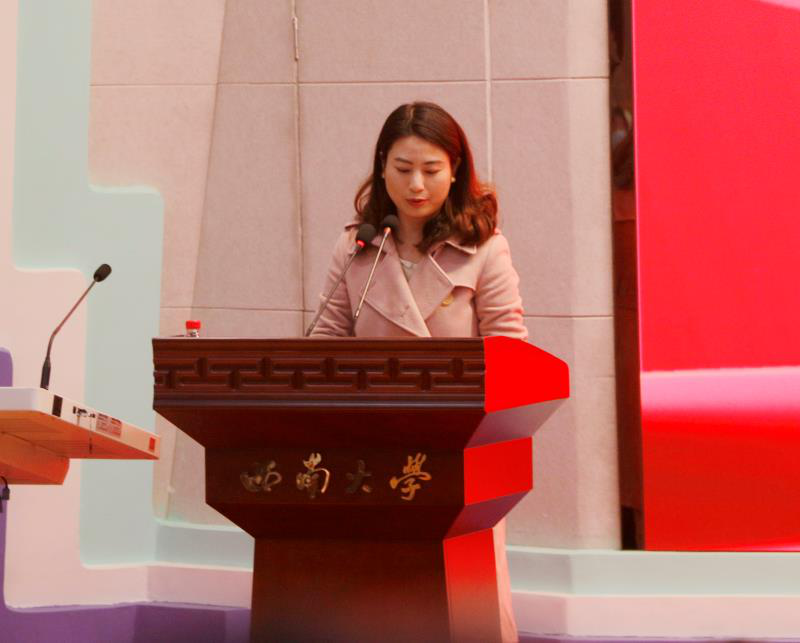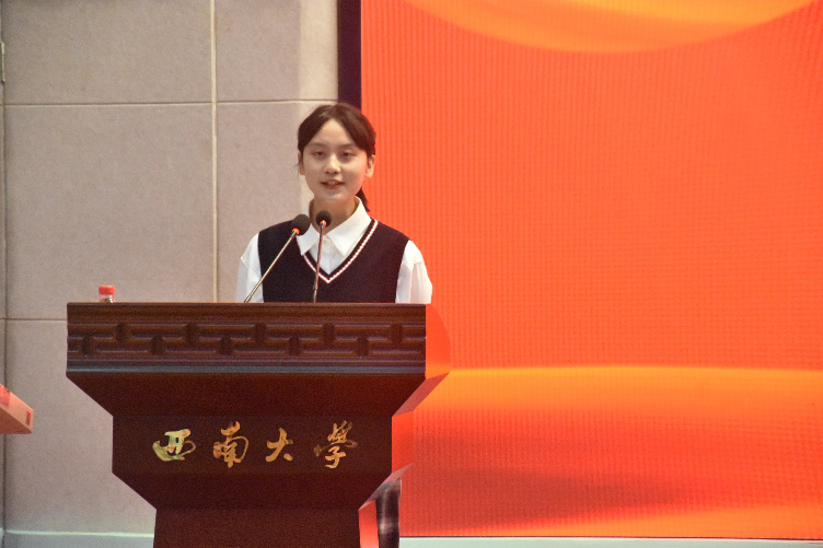 随后,2020级计算机科学与技术专业殷文逸同学代表全体学员发言。她在发言中讲道,要发展广大优秀青年作为我们党和国家发展的生力军,而青年团校是发展广大优秀青年成为党和国家发展生力军的重要课堂,号召同学们把握好机会、努力提高自身素养与思想觉悟争做陈独秀先生口中的“进步青年”,成为祖国的栋梁,为中华民族的伟大复兴添砖加瓦。