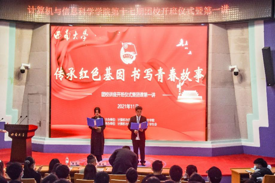 为着力推进共青团的改革发展,提升我院团员综合素质,激发广大青少年的积极性,计信院于2021年11月28日在25教一楼报告厅举办以“传承红色基因,书写青春故事”为主题的团校系列讲座。出席开班仪式的嘉宾有天涯社区