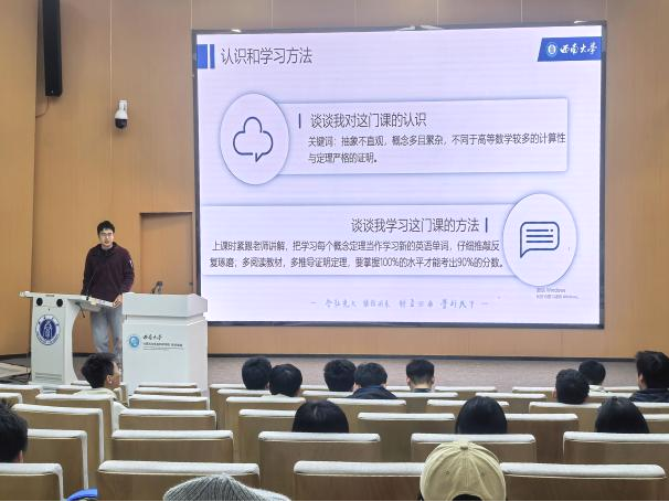 线性代数I》由2023级秦轶同学作为主讲人。他坦言初涉线性代数普遍会感到迷茫与挑战。随后他分享了如何调整学习策略,将复杂抽象的概念学习类比为词汇积累,强调深入理解与反复推敲的重要性。在日常学习中,他建议同学们紧跟教师步伐,对模糊概念回归教材进行验证,确保掌握每个定理的内在逻辑。面对期末复习,秦轶鼓励同学们:“唯有达到100%的掌握程度,方能考出90%的佳绩。”倡导同学们在复习的过程中主动梳理疑难点,明确重点与非重点知识,做到心中有数,有的放矢。最后,秦轶同学分享了其精心梳理的学习笔记,对每一章节的重点知识与难点概念做了深刻的提炼与总结,为同学们树立了学习典范,提供了具有借鉴意义的学习范本。