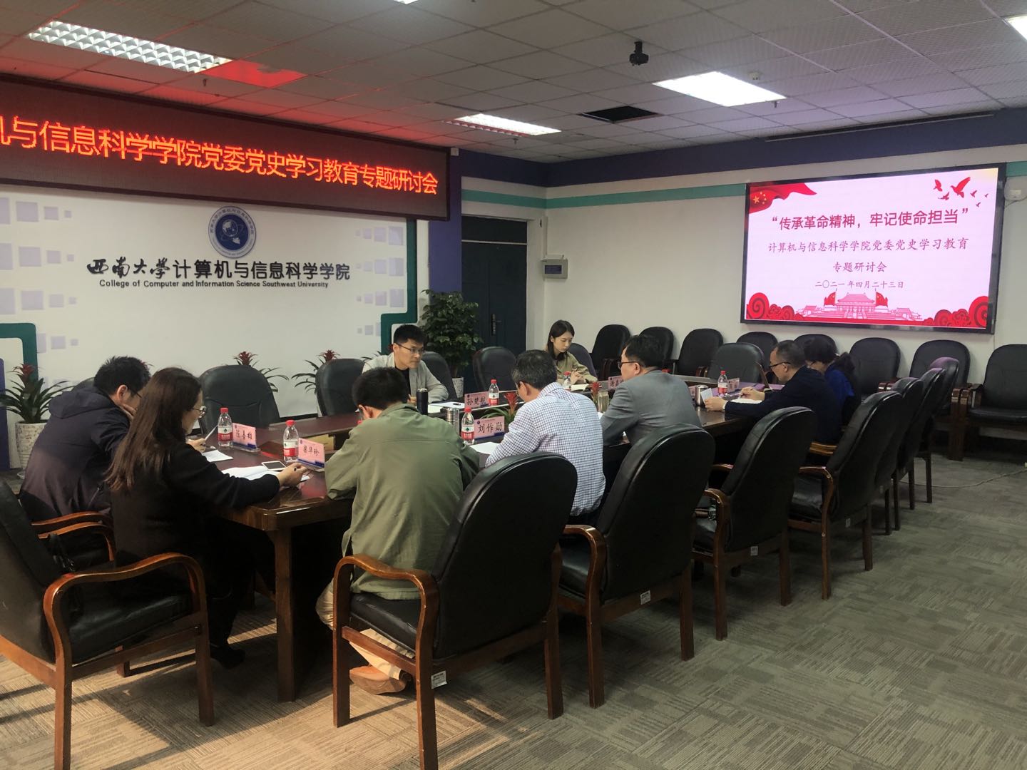 【党史学习教育系列报道】2021年4月23日下午,天涯社区 党委党史学习教育专题研讨会在25教1314会议室举行,研讨会以“传承革命精神,牢记使命担当”为主题,学院全体党员领导班子成员及党委委员参加研讨,...