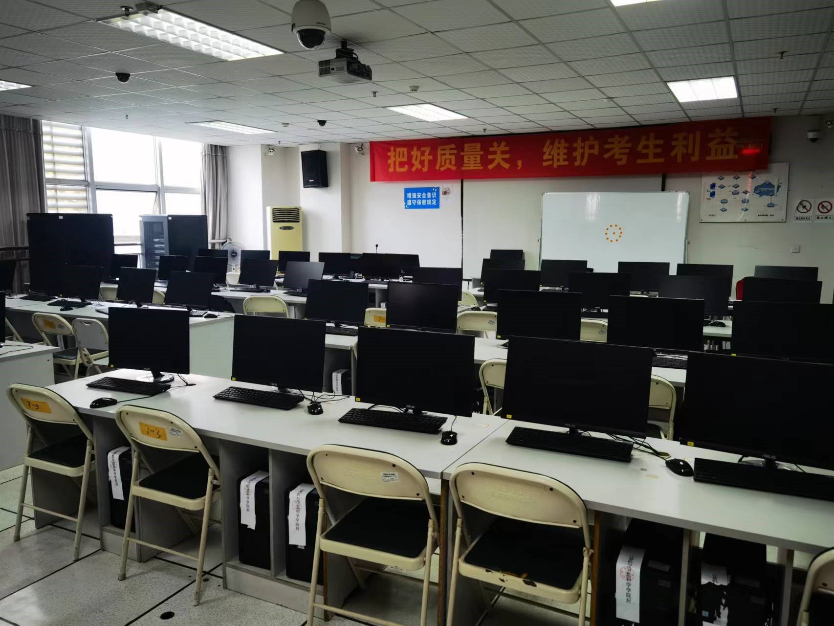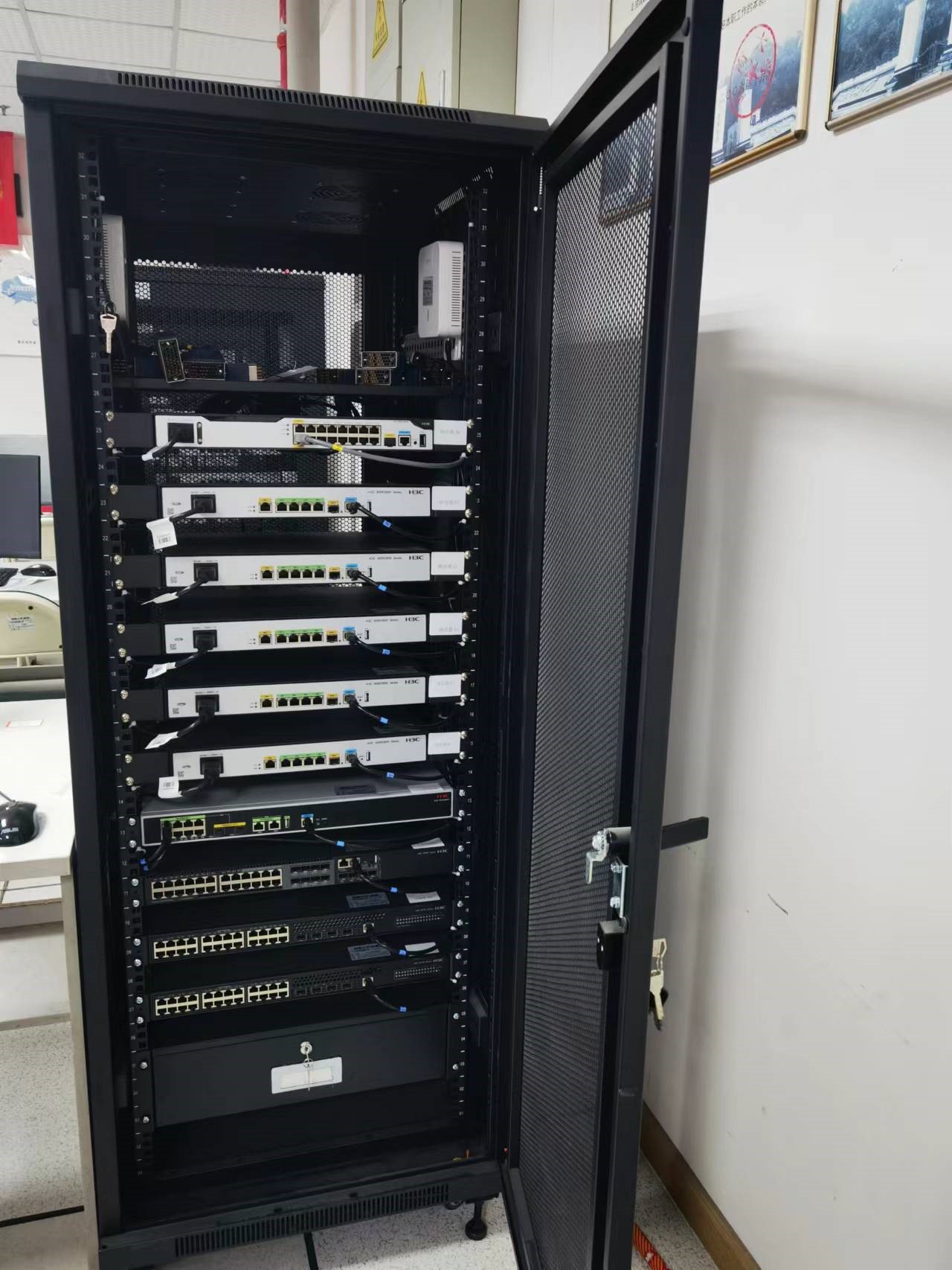 该实验室共设置10个机柜,每个机柜配置路由器(H3C MSR 2600-6-X1)5台、三层交换机(H3C S5560S-28P-EI)1台、二层交换机(H3C S5130S-28P-EI)2台、终端控制器AC(H3C WX2560X)1台、终端接入设备AP(H3C WA6320-SI)2台、设备管理控制台DMC(H3C MSR 2600-17)1台。每个机柜配备5个计算机终端,实验室可容纳50名学生同时进行网络实验。