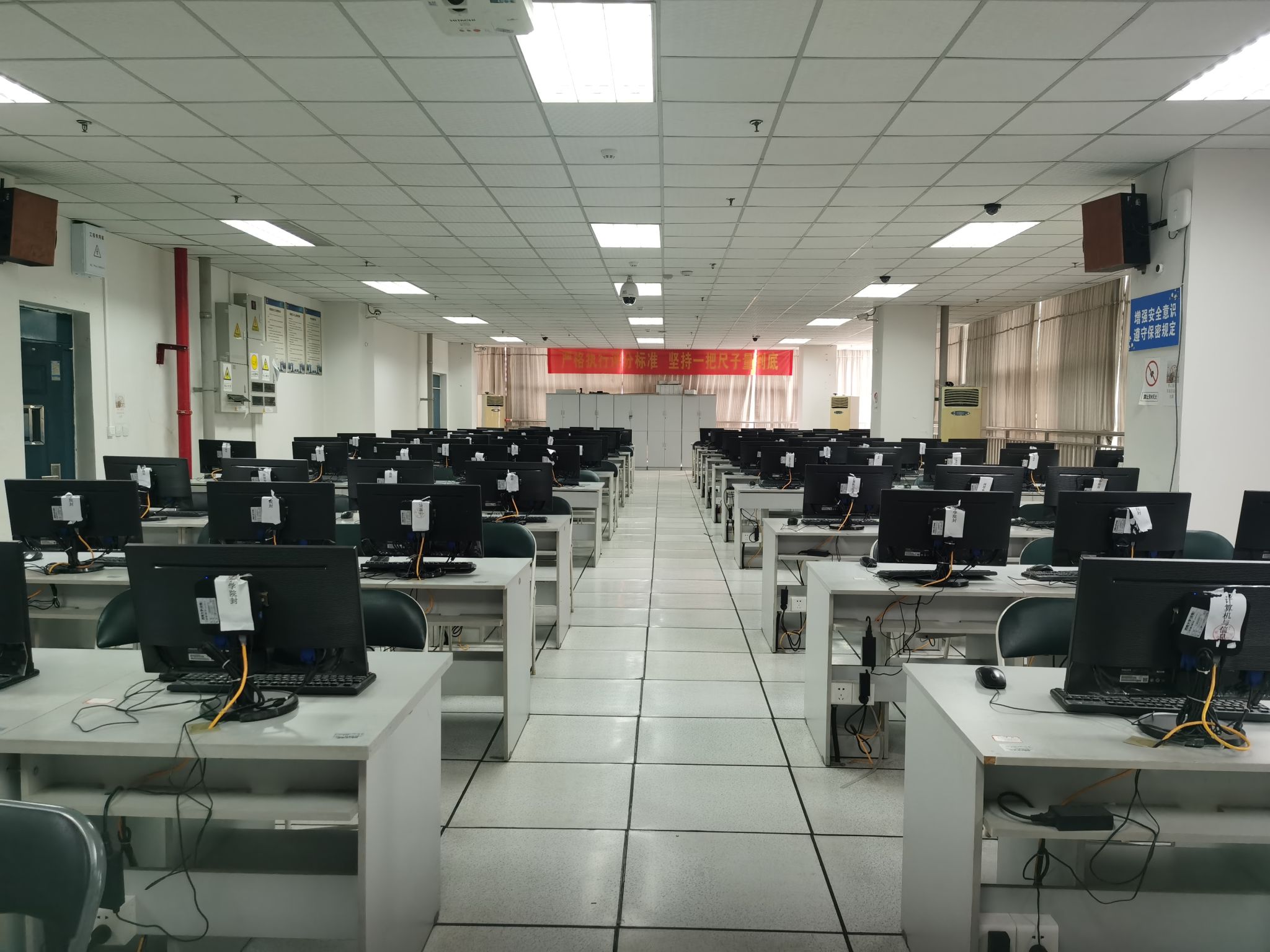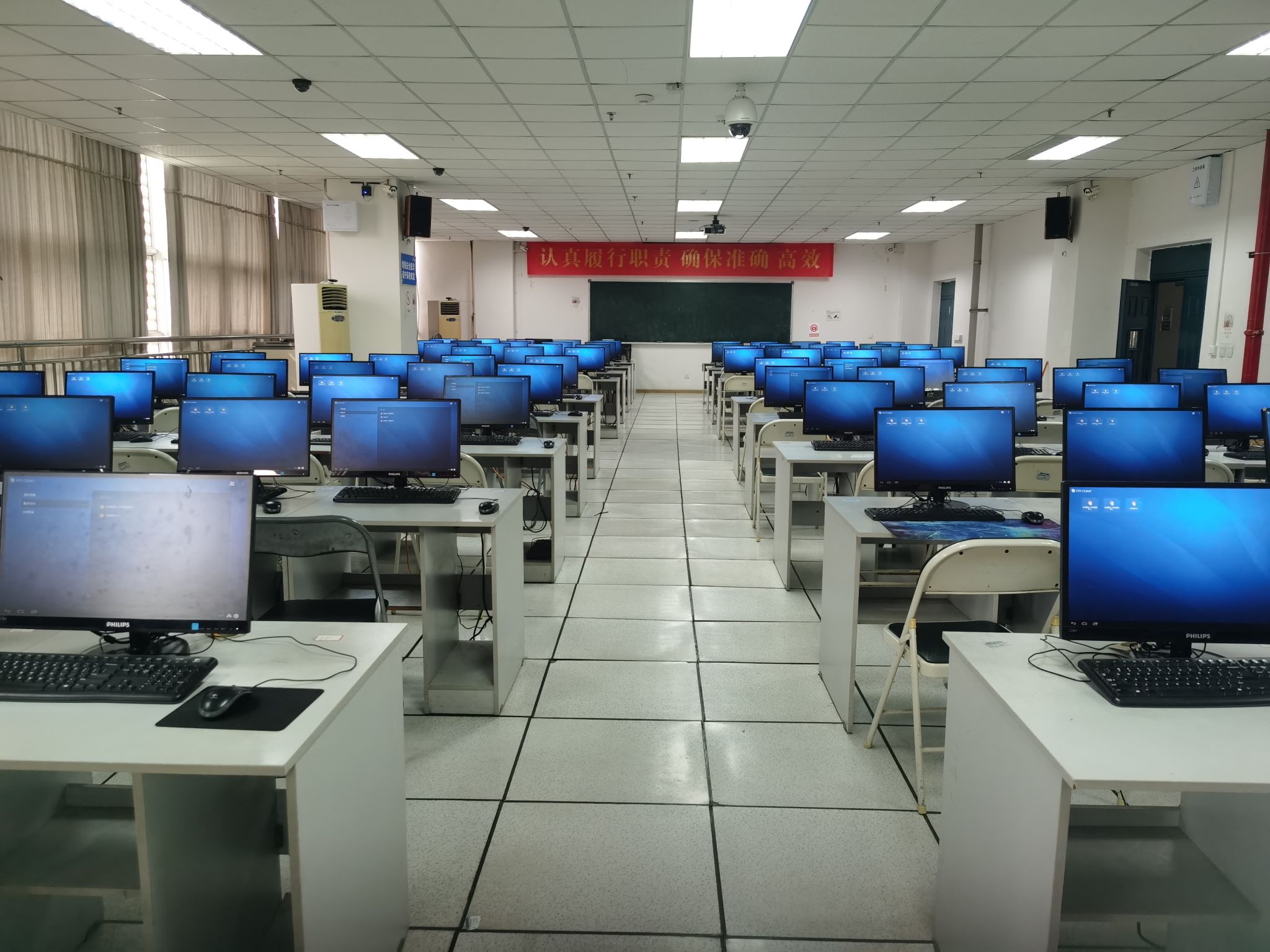 该实验室共有103台学生机,1台教师机,主要面向专业课程和公共课程,提供全校的大学生计算机基础课程平台,另支持天涯社区